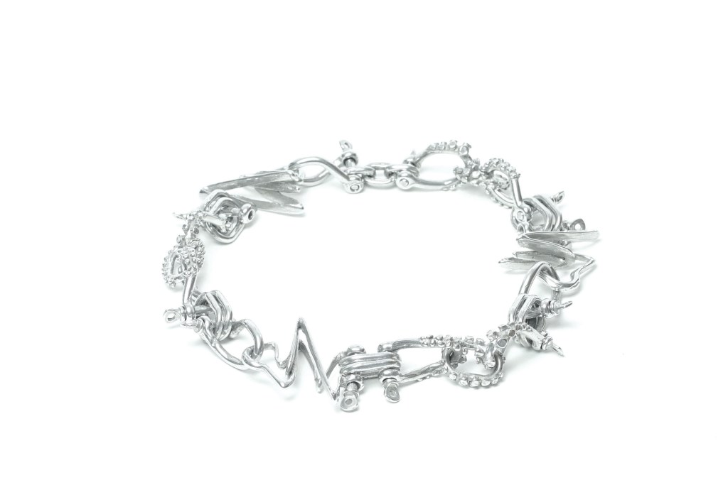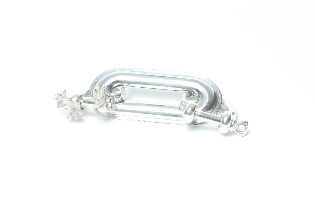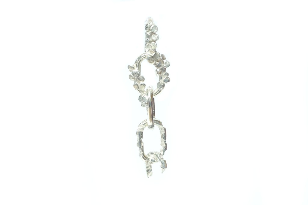 Carolin Dieler’s Sublime Devastation asks us to return to the sea – to a place of primordial connection and origin. But the metal links and digitized blades of seaweed go beyond a nostalgic lust for return – their shined surface and glitch-driven forms point to a future in which everything is chrome. The forms themselves were never the tentacles, tendrils, and claws that they pretend to be, but that doesn’t mean that each chain and earring doesn’t still want to return to the sea. Dieler’s jewels were born in the digital and want to go back to a place they may have never been. Whether we go along with them is the question.