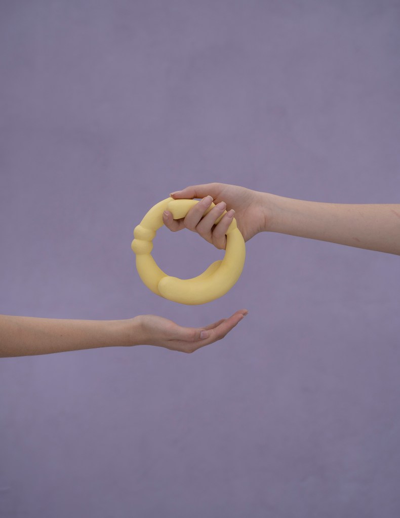 Haydee Alonso’s work is centered around connections and interactions. Each piece asks to be held, and often asks to hold back. In the age of Social Distance these works of bodily contact are brought into a new light. The delicate curves of a ring on a bright-colored background have a different impact when the hands that hold it can no longer touch. These moments of connection and human contact become almost alien as we live our lives virtually and remote. But Alonso’s work refuses to let go, these connections are too vital and too necessary to put aside. Her work asks how we can replicate or create surrogates for touch, and how we can be together, even when we have to be so far away.