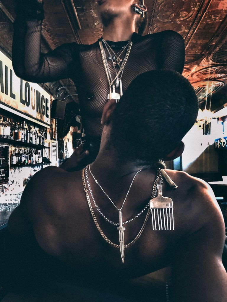 Now, I design precious metal pieces that feel custom-made for rock stars who think outside the jewelry box. My Brooklyn-based brand, Heavy Metals NYC, is an eclectic mosh pit of fashion-forward, avant-garde, and luxe designs that scream, “I’m with the band!” My playful collection features pierced nipple necklaces, hand-forged sterling silver swords, West Side/Rock On/Eff U/Namaslay bangles, Midnight Marauder knuckle dusters, and a sumptuous set of Wolverine claws. It also boasts prideful pieces like the Shattered Shackles “Blk AF” ID bracelet, Afro pick pendants, Wakanda Salute necklace, and a beautifully badass Black Panther Claw.